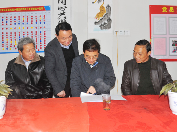 还未走到霞西村第七党小组活动室,鲜红遒劲的毛笔字先一步印入眼帘,“立党为公,发展利民”八个大字不仅印在墙上,也刻进党小组党员的心里。在活动室内,王普和党小组长李家富同坐一张桌,聊起活动室老李显得很是自豪,“这是用我自家仓库改造的,别看活动室小但五脏俱全。”活动室内装点着他自己书写的对联,火红的桌布和座椅,驱散了冬日的寒冷,昭示着一片拳拳党心。王普翻看着党小组的活动记录,“农村的党小组是最基层的党组织,也是最难抓实的,但是你们做得很细致很扎实。”霞西村第七党小组坚持每月以不同主题开展“党员主题活动日”,理论学习、捐款慰问困难户、参加集体志愿服务……内容丰富多彩,“在外做生意的党员活动的时候也会回来,我们的党建之‘家’让他们有了归属感,整体的凝聚力都提高了。”李家富说道。结束在党小组活动阵地的参观,王普表示,要扎实做好新形势下农村基层党建工作,特别是要在落实“细胞”工程上下功夫,突出落细落小,使“细胞”保持鲜活,霞西村党小组做法为创新党员管理提供了很好的借鉴。
